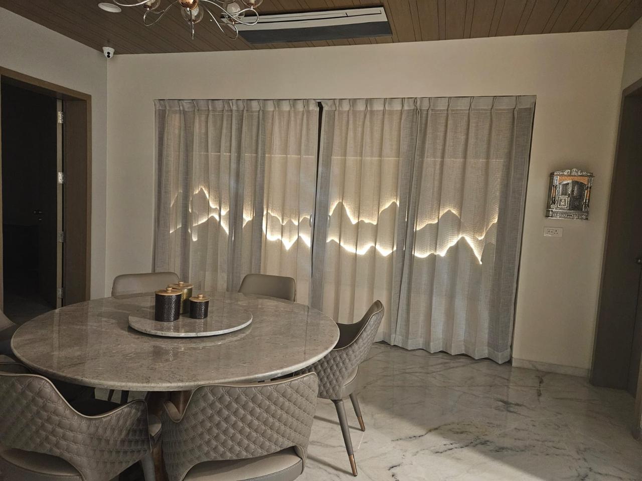 The ceiling design, with its sculpted circular recess and integrated lighting, introduces a controlled layer of visual dynamism without disrupting the minimalist ethos. It reflects a careful balance between expression and restraint, an approach that defines expert-level minimalism.